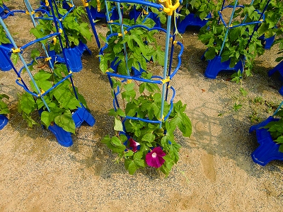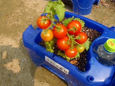 写真左は1年生が育てている「あさがお」です。早くも一部、花が咲き始めました。つるもぐんぐん伸びています。写真右は2年生が育てている「ミニトマト」です。食べごろ寸前といったところでしょうか?太陽の光を浴びて、成長する植物に、感動しながら学びを深める低学年達です。