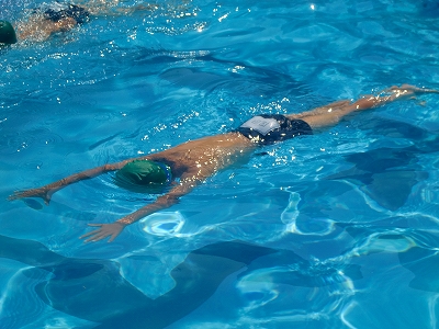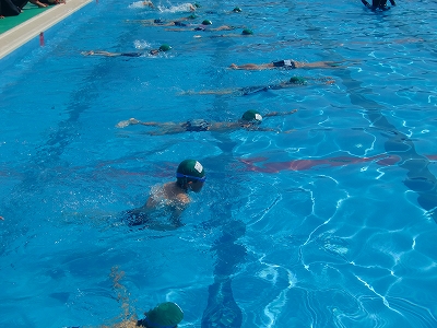 写真は3年生達が「けのび」を練習している様子です。クロールは腕で水をかき推進しますし、平泳ぎは足で水をけり推進しますが、最もよく進むのはけのび状態の時です。物理的に考えても、水の抵抗を受けない姿勢が進むわけです。美しいけのびを練習する3年生達に、降り注ぐ光と水面のキラキラがまぶしい夏、真っ盛りです。