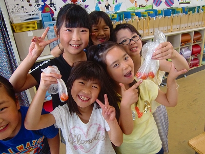 7月4日(木)2年生:もぎたてのミニトマトを持って、はい「チーズ」
