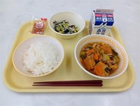 今日は、米粉チキンカレー、麦ごはん、枝豆コーンソテー、ヨーグルトでした。みんなに...