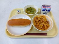 今日はスパゲッティミートソース、チンゲン菜のスープ、ベビーパン、プチチーズでした...