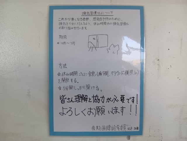 保健給食委員会による、休み時間に換気をしようという取り組みです。