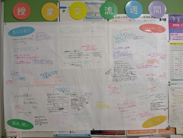 今回は授業を見に行くだけではなく、疑問や授業のおすすめなど、好きなように書き込むことができる模造紙を職員室に貼りました。