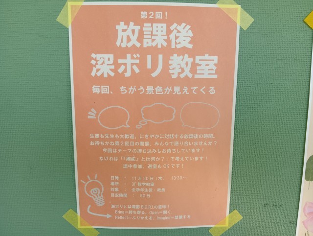 深ボリとは、深野B.O.R.I.の略語で、深野は深野中学校、B.はBring(持ち寄る)、O.はOpen(開く)、R.はReflect(ふりかえる)、