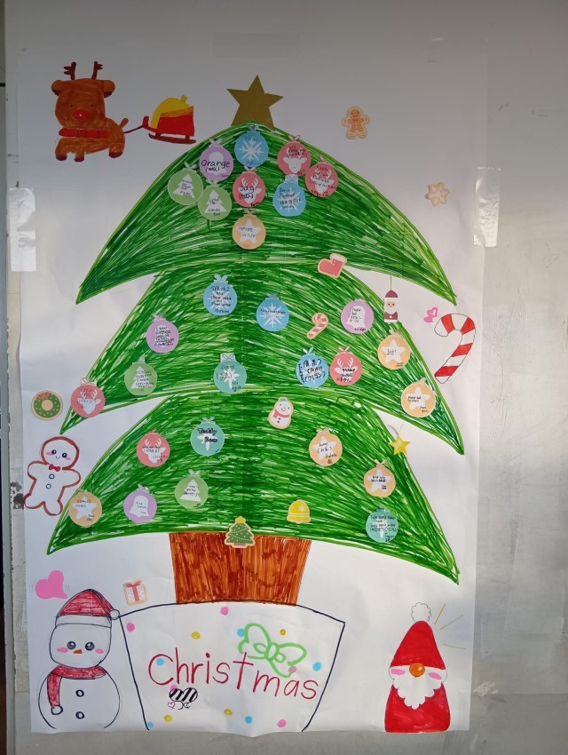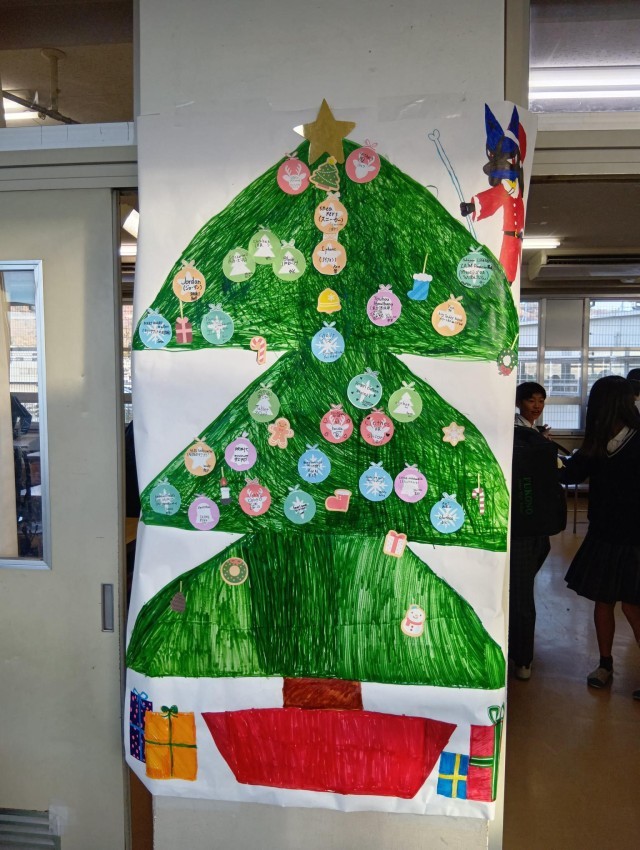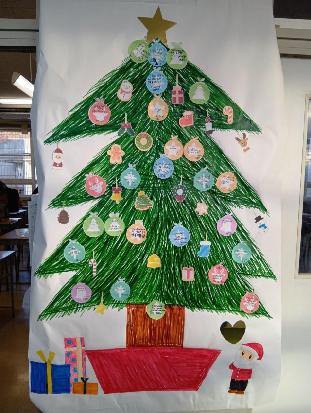 (添付した写真は、1年生が取り組んだクリスマスツリーです。本日は、クリスマス。みんなの思いがサンタに届けばいいですね。)