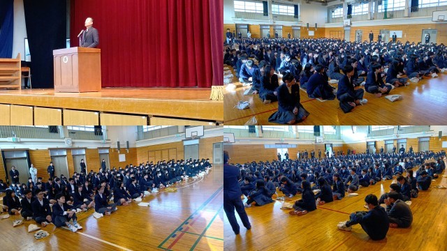 (感染拡大防止の観点により、2学期末の終業式はリモートで行いましたが、本日の始業式は体育館で行いました。)