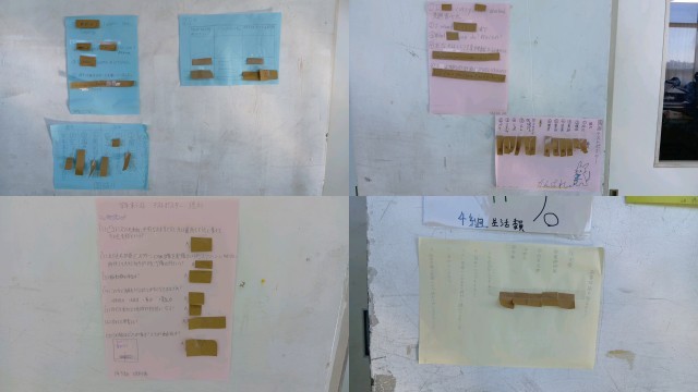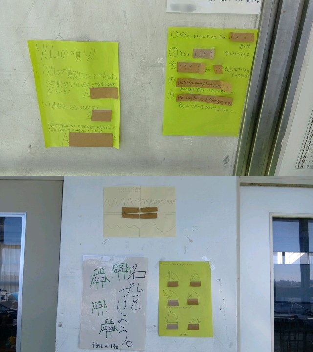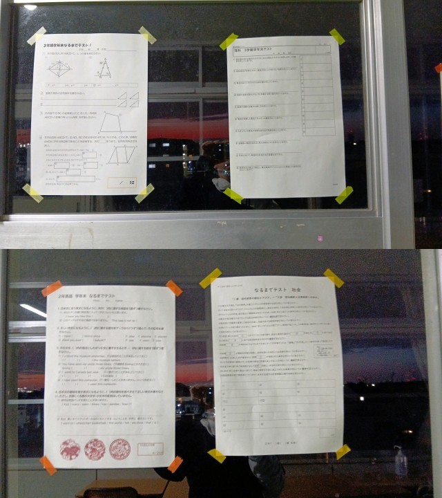 写真は、廊下に掲示されていたなるまでテストや対策問題の数々です。