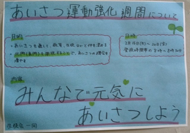 元気な、明るい学校を目指して、「あいさつ運動強化週間」が行われました。