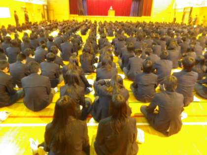 《写真上:体育館での始業式》
