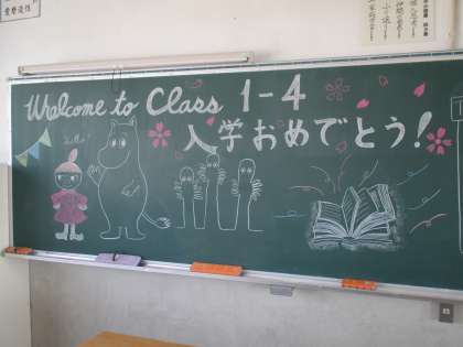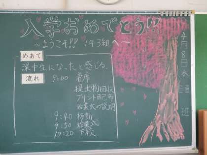 1年生にとっては初めて中学校の登校となるはずだった今日。それぞれの教室には1年生の皆さんを迎える絵をそれぞれの担任が工夫しながら書いていました。