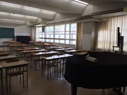 音楽の授業では、いろいろな国やジャンルの音楽を聴いたり、音楽をみなさん自身が表現したり、仲間と音を合わせるのを楽しんだりします。深中生は歌が大好きです。今は「みんなで合唱」が難しくても、音楽を楽しむ心は忘れず生活にいろどりを加えられるといいですね。音楽室では、深中に到着したてのグランドピアノがみなさんとの出会いを楽しみに待っていますよ。