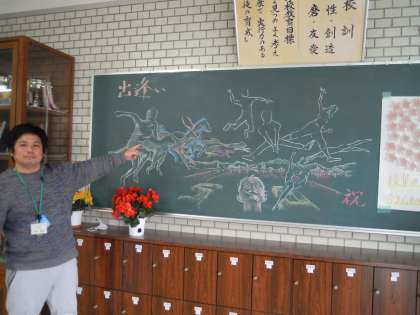現在は美術家の大川先生が1年生のためにチョークで描いてくださいました。