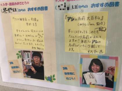 さて、深野中学校では新年度のスタートに合わせて、先生方におすすめ図書のアンケートを取りました。そして、上の写真のようにポスターを作り、廊下や階段に掲示したのですが、生徒のみなさんの登校する機会がない日が続いてしまっっているので、ここでいくつか紹介していきたいと思います。読む本を探している人は参考にしてみてください。