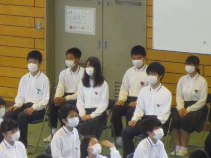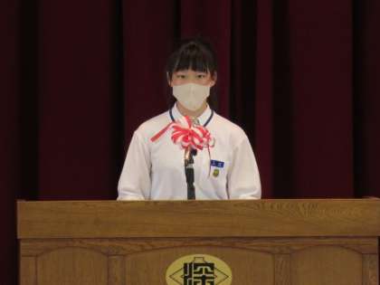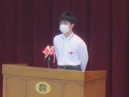 写真は上から、生徒会長の「歓迎のことば」、入学式に参列した生徒会役員の生徒、新入生代表の「誓いのことば」です。