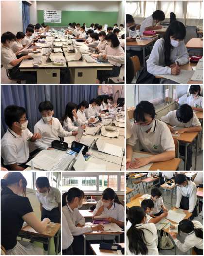 2年生の技術では、コンピューター教室でのパソコンを使った授業を展開していました。今さらながらですが、パソコンは共有の使用物ですので、もちろん学校では消毒をしますが、生徒のみなさんもマイボトルでしっかりと確実に手指消毒してくださいね。