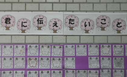 玄関ロビー付近の廊下には、3年生から1・2年生へ卒業前のメッセージが貼り出されています。