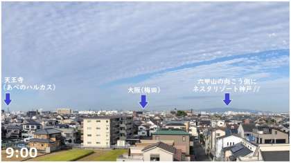 深野中学校の校舎から西側の景色は、大阪市内を見渡せる絶景スポットです。今日は天気も良く、六甲山の山並みもはっきりと見えます。その向こう側にネスタリゾート神戸があります。