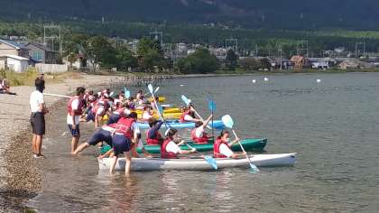 昼食後にカヤックのレースをしました。