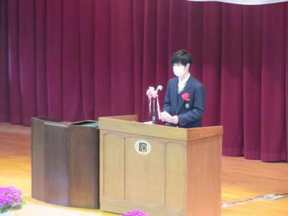 卒業生代表の「旅立ちの言葉」は、親への感謝の言葉と先生へのお礼とともに、仲間と一緒に過ごした3年間を振り返り、仲間の大切さと有難さ、そして、別れの寂しさを込めた素晴らしいものでした。