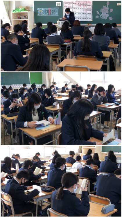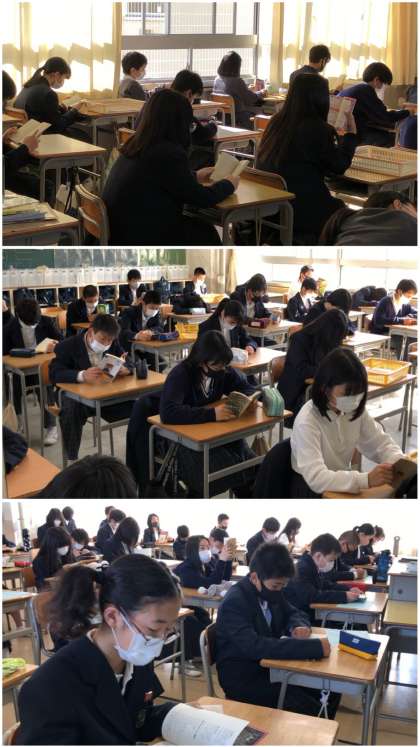 深野中学校では、静かに穏やかな気持ちで学校生活をスタートさせるために、8時30分からの10分間を読書の時間としています。