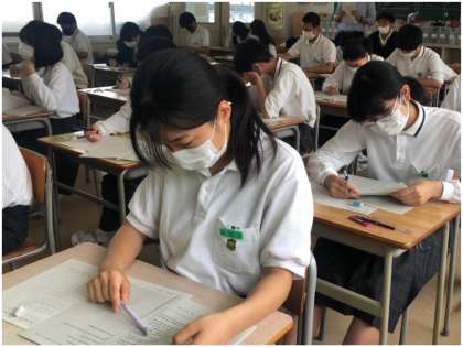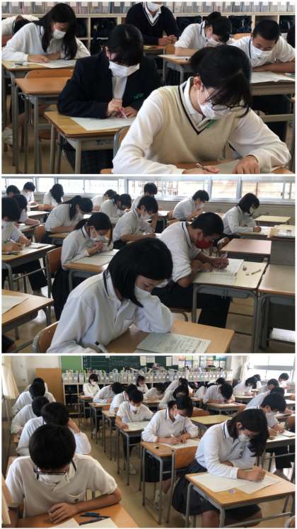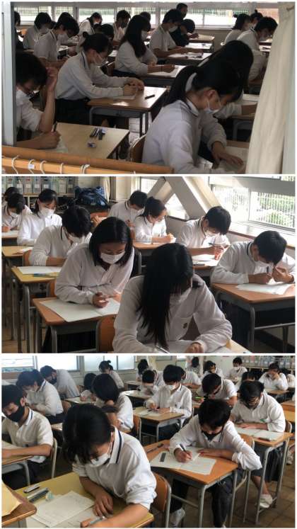 3年生の今日のテストは、英語・理科・社会・保健体育です。