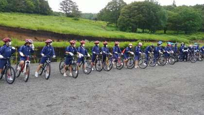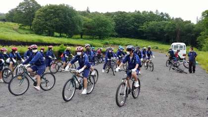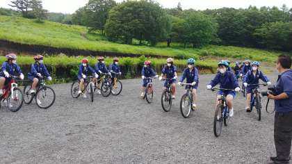 体験活動、マウンテンバイクです。説明を受けた後、慣らし運転の様子です。