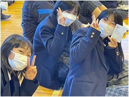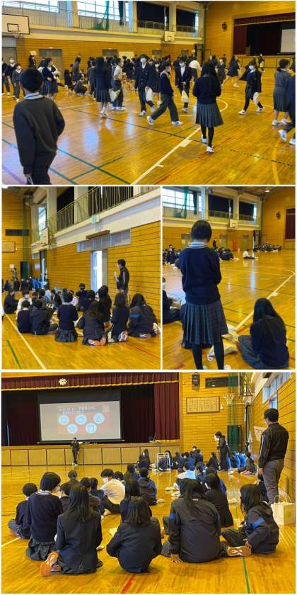 体育館で「もし世界が100人の村だったら」を全員で体感するワークショップを行いました。