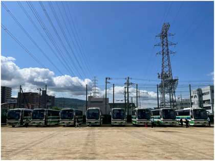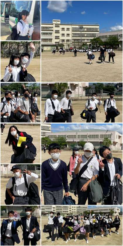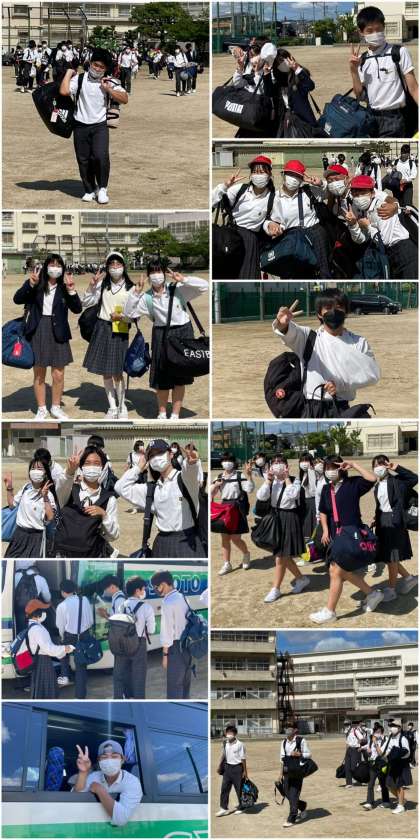8時35分…、バスが入ってきました。グラウンドに8台!並びました。ほぼ予定通り、8時50分過ぎにバスに乗車しました。乗車前には手指の消毒をします、係のみなさん、早速のお仕事ありがとうございます。