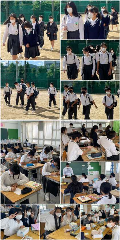 現在、3年生は修学旅行に出ていますが、1,2年生のみなさんはもちろん学校で1日を過ごしました。今日の学校生活をダイジェストでお伝えしますね。まずは、登校から授業のようすです。