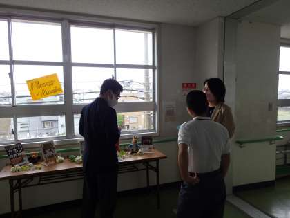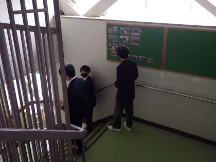 廊下で先生と、グラウンドで友だちと、階段で写真を見ながら、