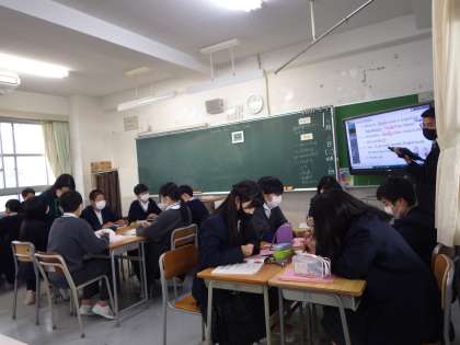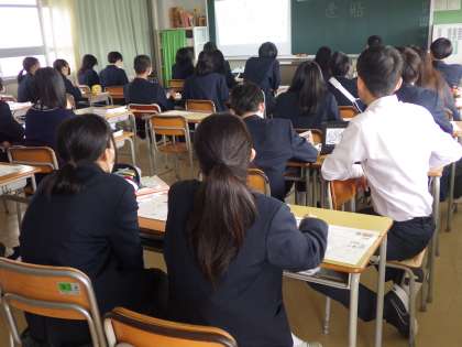 校舎内では、ペア学習や班学習、いろいろなかたちの学びが行われていました。