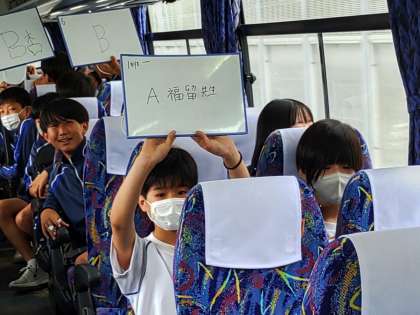 行きのバスの中では、レク係がバスレスをしてくれています。