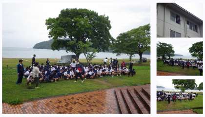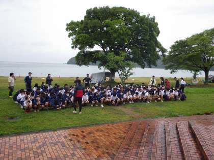 2年生は、いかだ体験の前に、学年集合写真を撮りました。