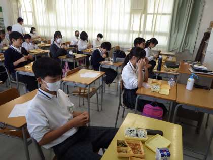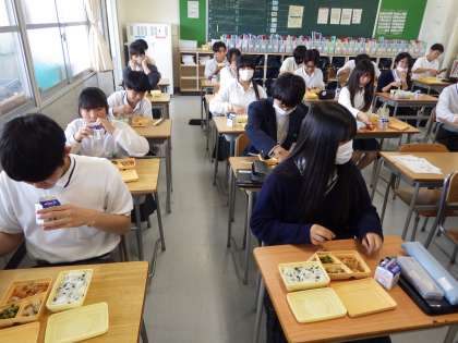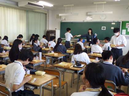今日のメニューは、わかめごはん、豚肉のバーベキューソース、ソーセージときのこのアヒージョ風、小松菜とコーンの炒め物、それと牛乳です。