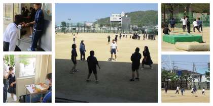 多くの生徒が運動場に出て、ボールを使い、遊んでいます。