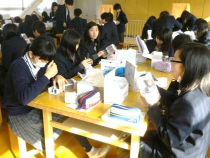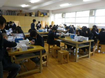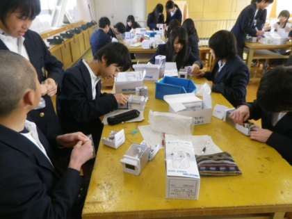 2年生技術科の授業は、「ダイナモ ランタン(発電機のついた携帯用の照明具?)」の組み立てでした。