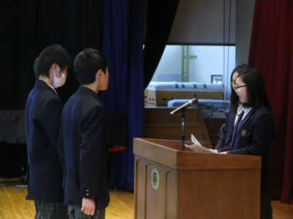 写真上:学習委員会より、自学自習ノートを頑張ったクラスへの表彰