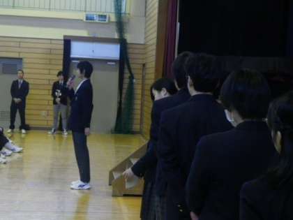 写真中:生徒会長より、明日(3/4)開催の「生徒総会」に向けての呼びかけ