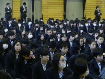 写真下:全校生徒は、落ち着いた態度で集会に臨んでいます