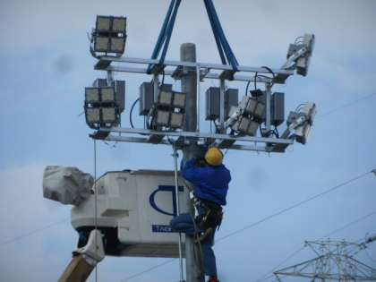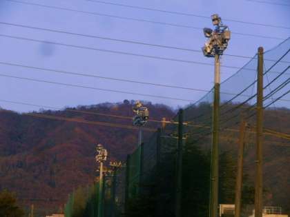 グラウンド周回の数箇所で進められている「照明設置工事」は、立てられた支柱にLED照明器具が取り付けられ、いよいよ終盤に入ったようです。