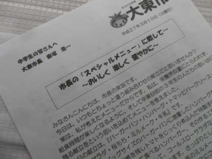 今日ばかりは、ほんのちょっとだけカロリーや塩分がいつもよりは多めでしたが、時には栄養摂取量にとらわれない中学生好みの献立を提供したいという、市長の配慮です。