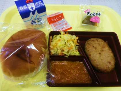 ハンバーガーにサラダ、ミルメークと牛乳、デザートは桜もち。