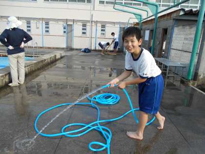 プールの掃除を行い、コースロープをはり、水泳の準備がすすんでいます。