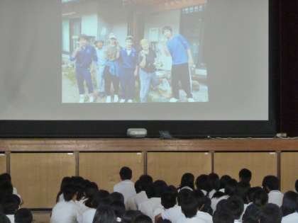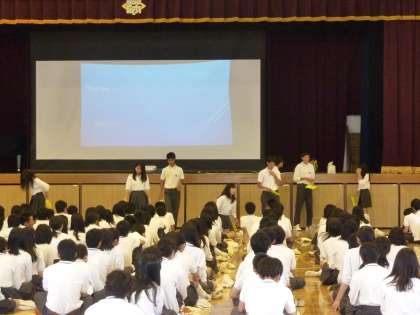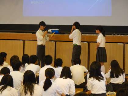 また、学年主任からは3年生にとって有意義な夏休みについての話、そして3年間の任期を終えて、この夏で帰国されることになったAET(英語指導助手)のジェー先生への43期生からの感謝のプレゼント贈呈など、盛りだくさんの内容でした。