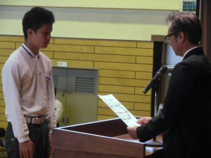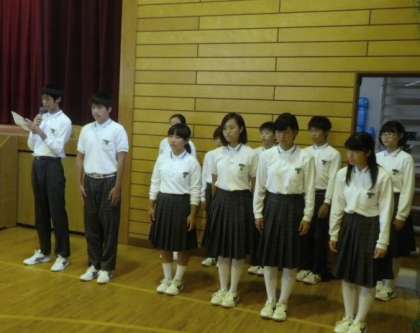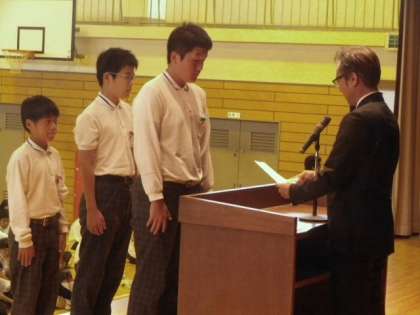 まずは、先日各クラスで決定した後期学級役員の認証式が行われました。 各学年1組の男子学級委員に、代表として認証書を手渡しました。 今日からクラス・学年のリーダーとして大いに活躍してくれることを期待します!