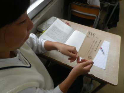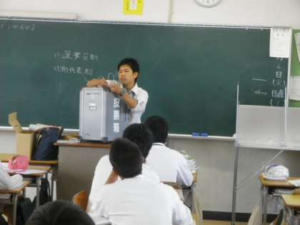 中学校でも社会科の授業で 「選挙」 について学習しますが、3年生では、大東市の選挙管理委員会事務局から実際の選挙で使用する投票箱と投票記載台をお借りし、「模擬選挙」 を行って選挙をイメージしながら学んでいきます。