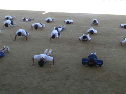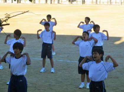 1年生男子は、「ベースボール型」球技の授業に入り、ソフトボールに取組んでいました。 準備体操や補強運動では、みんなで大きな掛け声をかけ、元気いっぱいの授業でした。