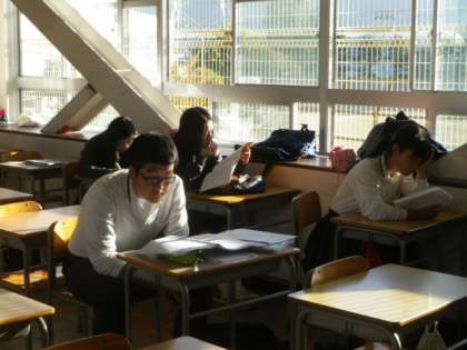 朝早くから登校し、テストに備えて最終確認をしている生徒の姿。