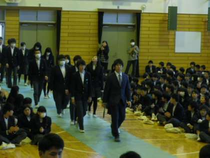 また、3年生の各クラス代表へ1・2年生から花束が手渡され、最後は3年生から1・2年生へ卒業の歌が贈られました。