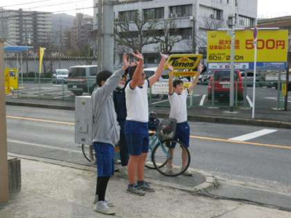 すでに受験が終わっている仲間が、激励に駆けつけてくれました。 集合場所になっている 野崎駅、四條畷駅、学校を 朝早くから周ってくれたそうです。